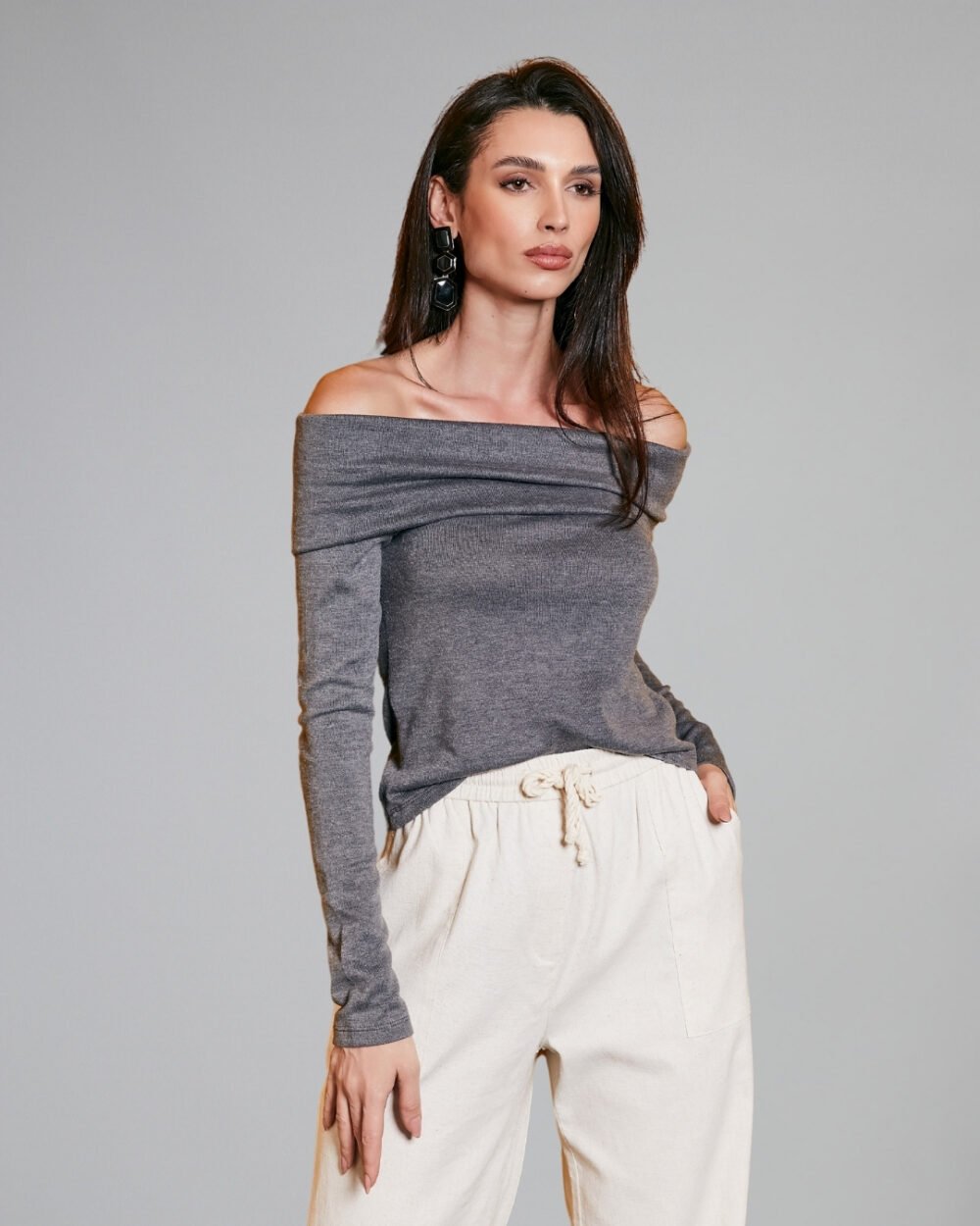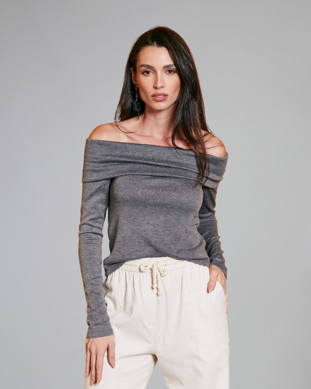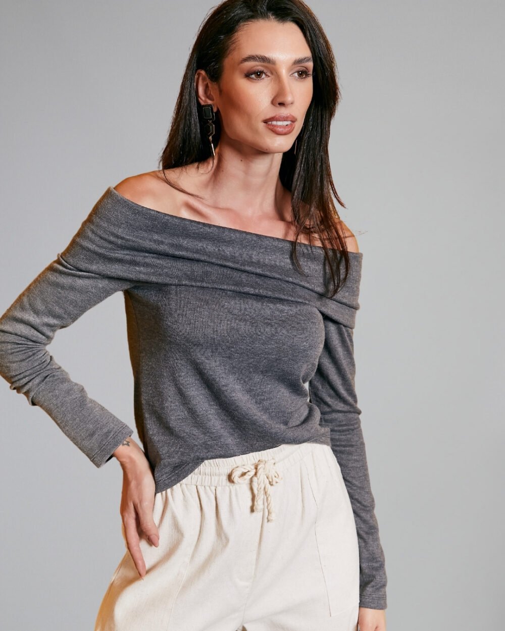 Blusa confeccionada em malha tricot premium com modelagem ombro a ombro. A modelagem ombro a ombro além de conferir um toque moderno, valoriza a região do colo de maneira sutil, resultando em uma peça que equilibra sensualidade, sofisticação e elegância com maestria. Mangas longas.
