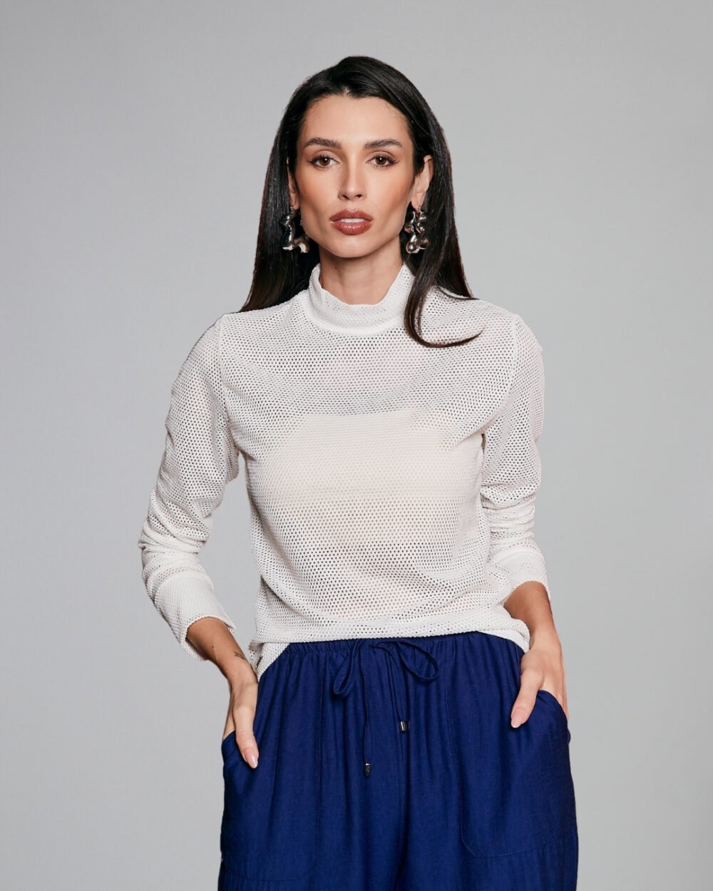 Blusa com mangas longas, possui leve transparência devido ao tecido em tela.