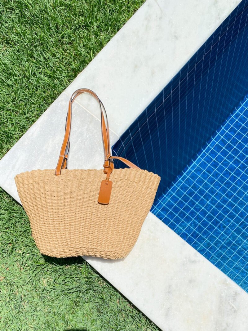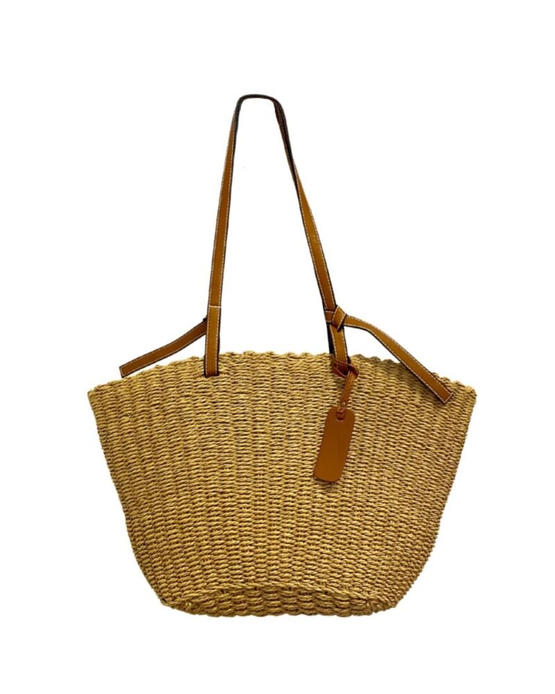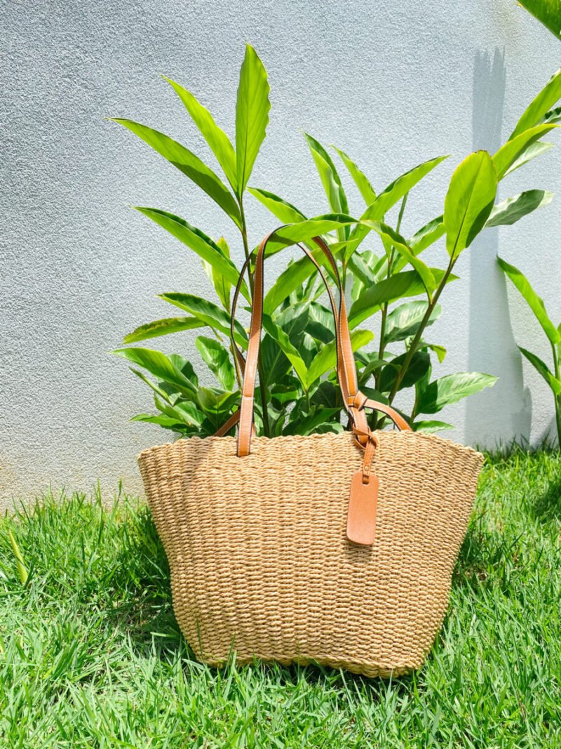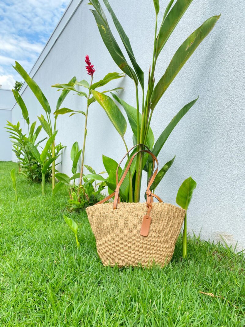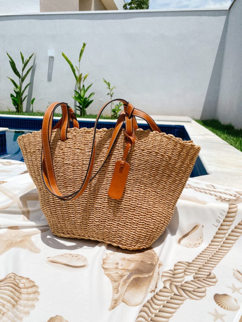 Bolsa tramada (trançada) com fitas feitas em celulose (material sintético que assemelha a palha).