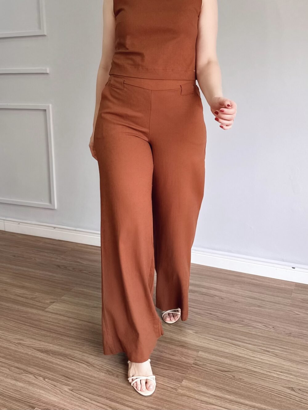 Sua modelagem de cintura alta valoriza a silhueta, enquanto as pernas amplas garantem fluidez e um visual moderno. O bolso posterior adiciona charme e praticidade ao look, tornando a peça ideal tanto para produções casuais quanto para propostas mais arrumadas no estilo resortwear.