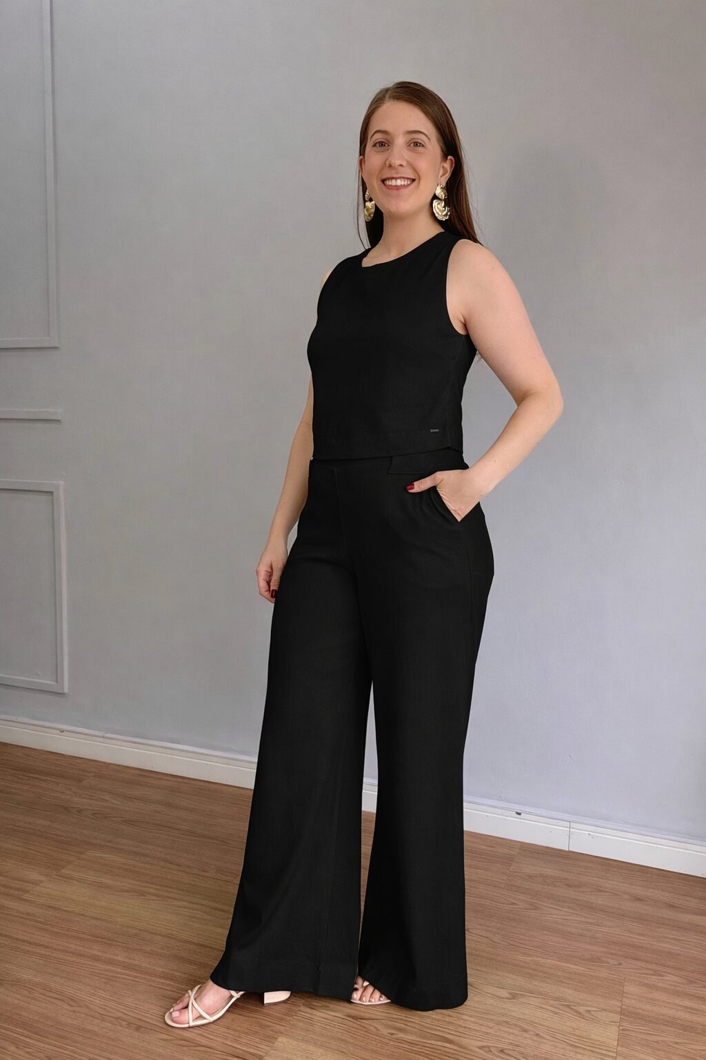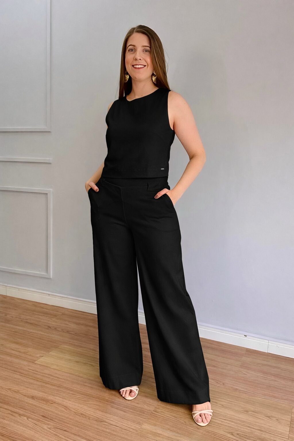A Calça Cannes Preta é a peça perfeita para quem busca elegância, conforto e versatilidade em um só design. Confeccionada em tecido leve e sofisticado, ela oferece caimento impecável, toque suave e liberdade de movimentos.
