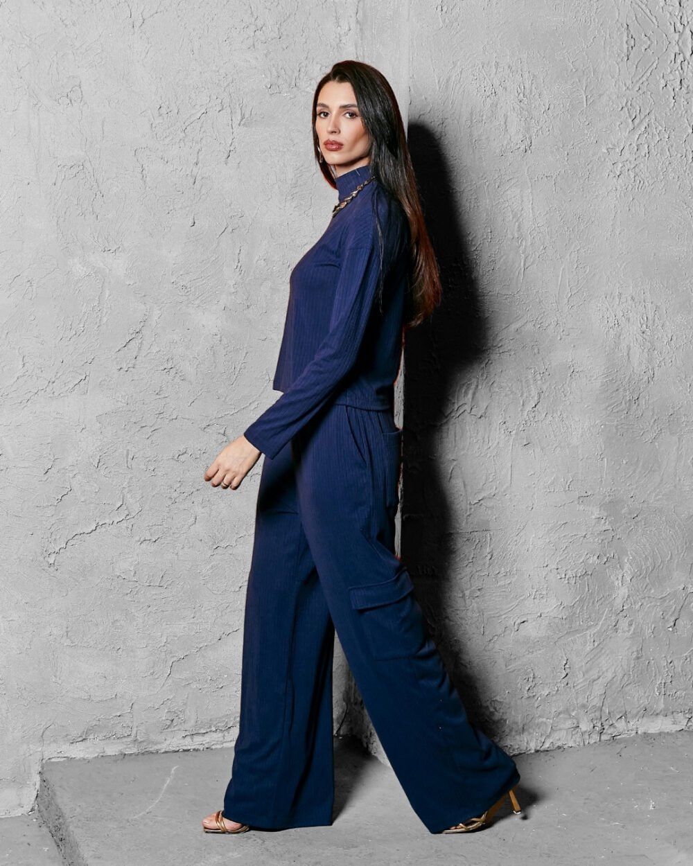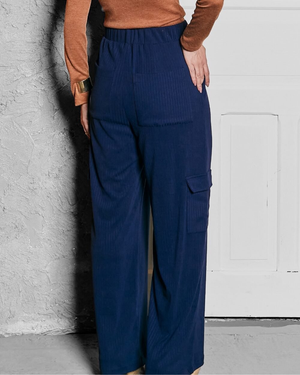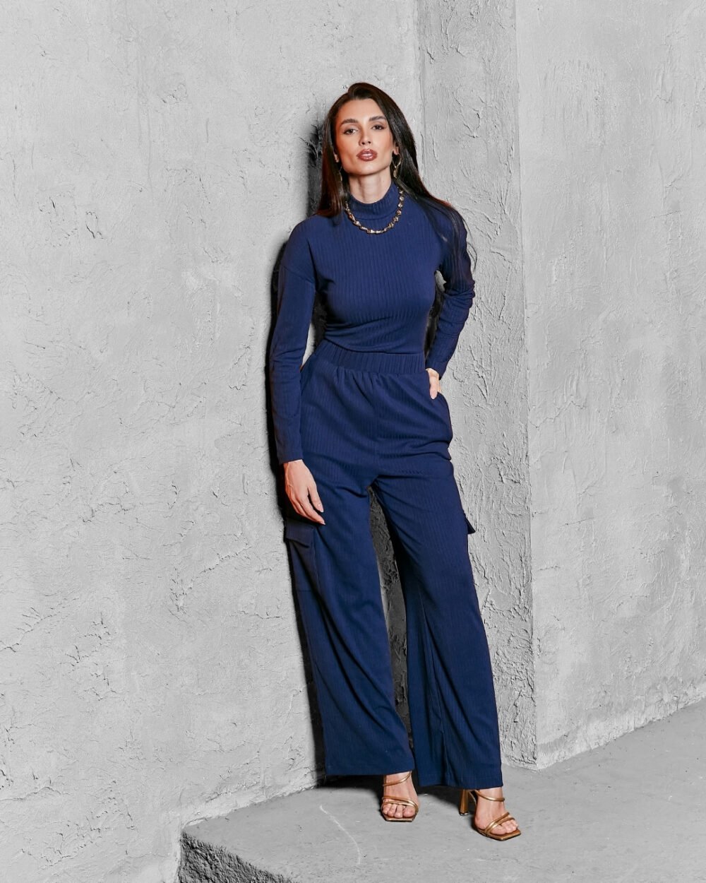 Calça confeccionada em malha canelada. Caimento reto. Possui bolsos laterais e traseiros. Cós com elástico para melhor ajuste ao corpo. Peça elegante e versátil para compor vários looks.