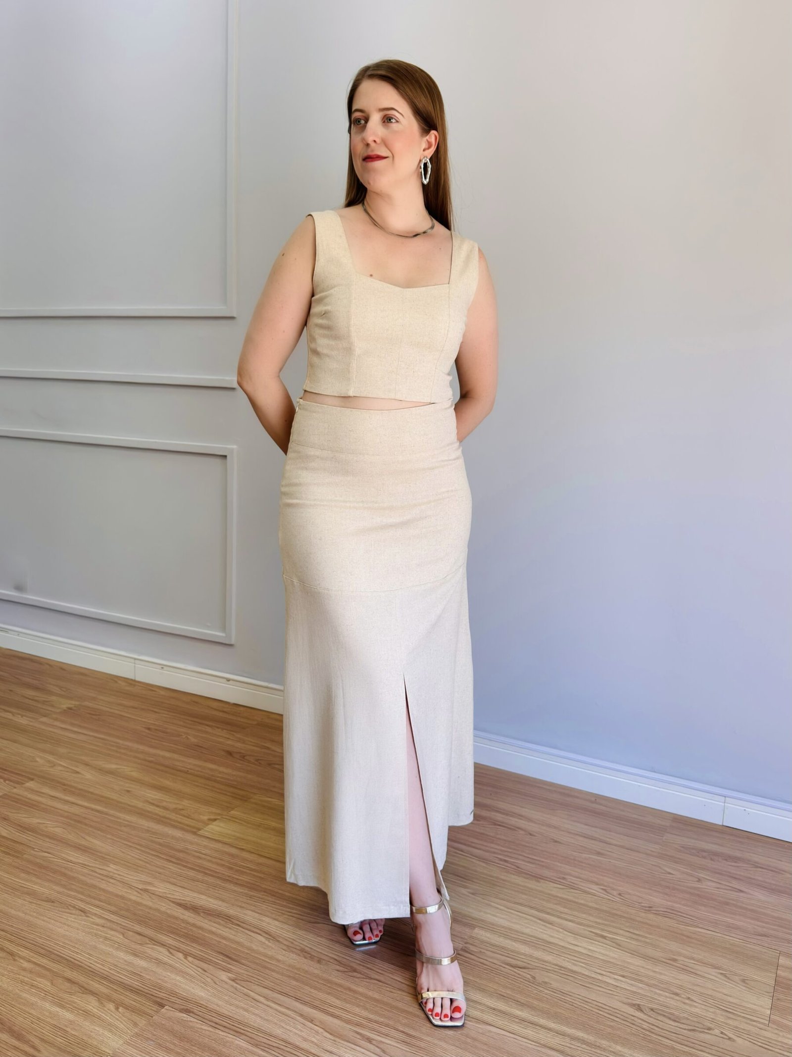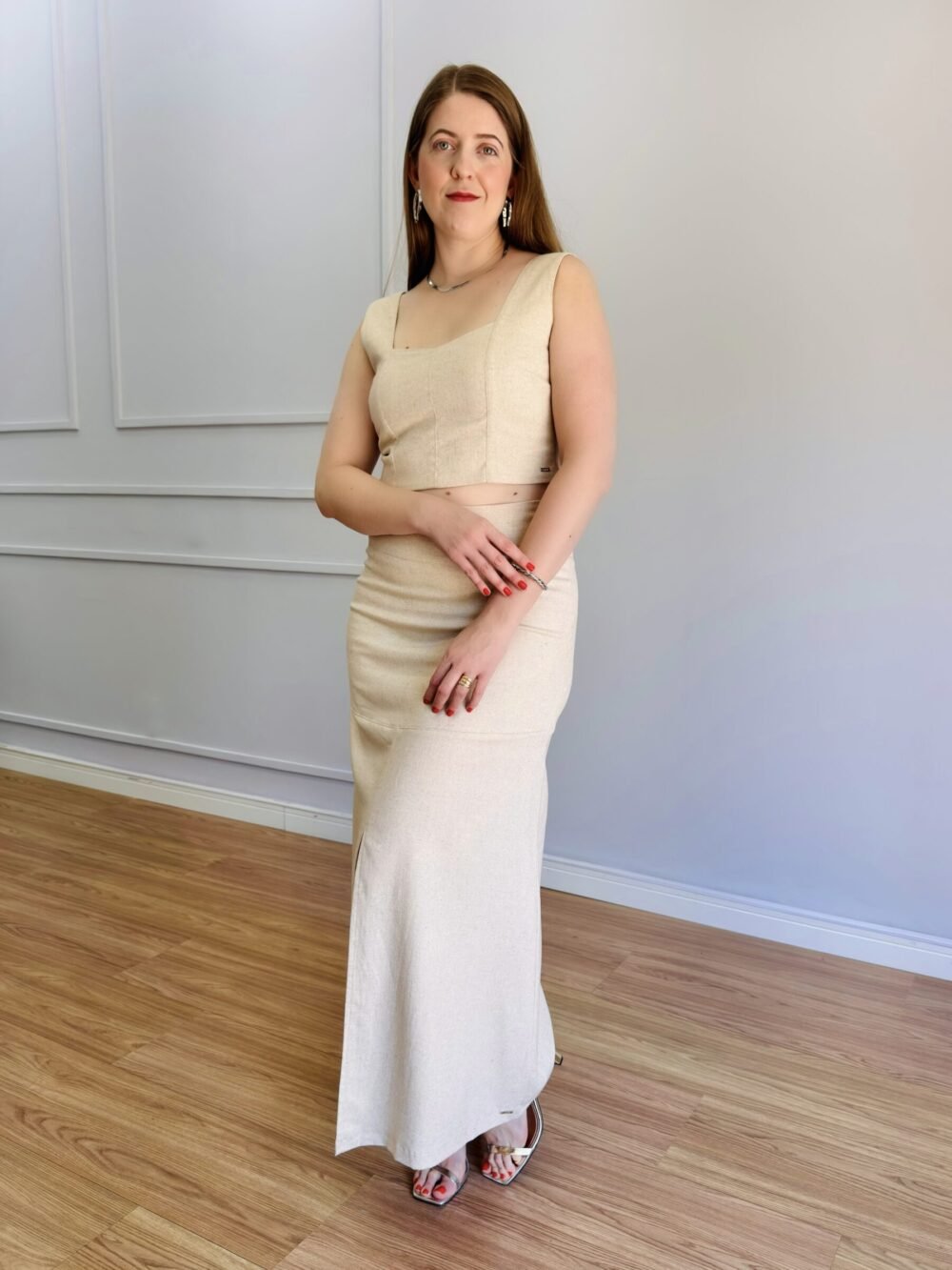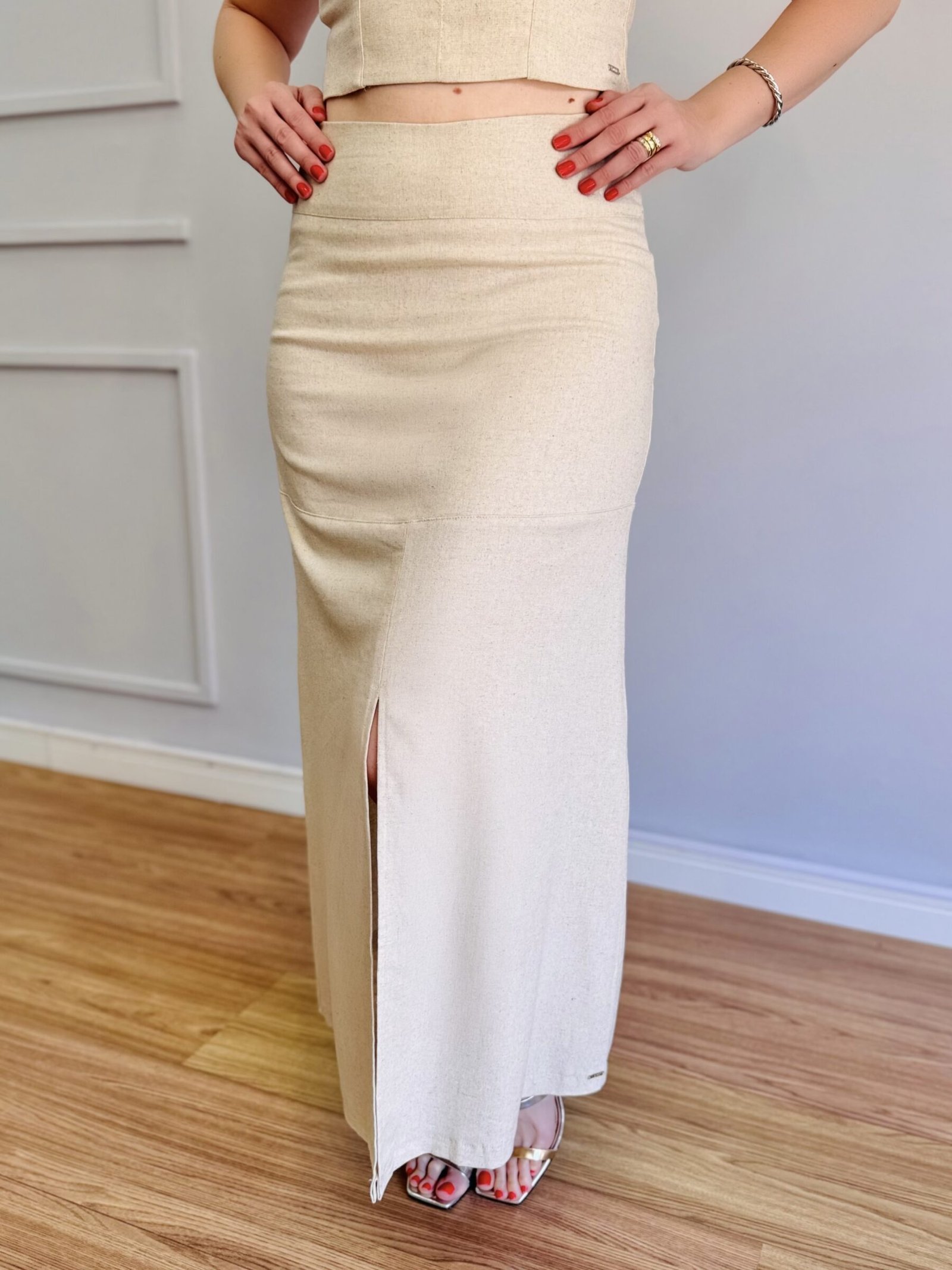 A Saia Menorca Cru é a definição de elegância e feminilidade com um toque contemporâneo. Confeccionada em linho com elastano, sua composição garante caimento impecável, conforto e leve elasticidade, acompanhando os movimentos do corpo com suavidade.