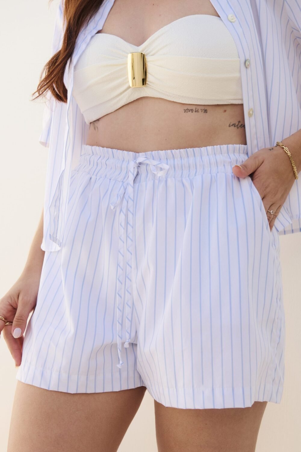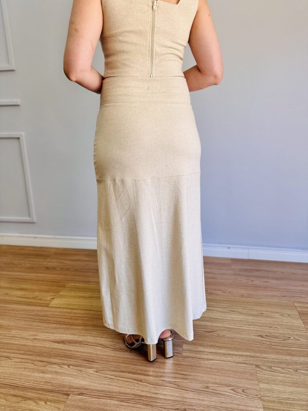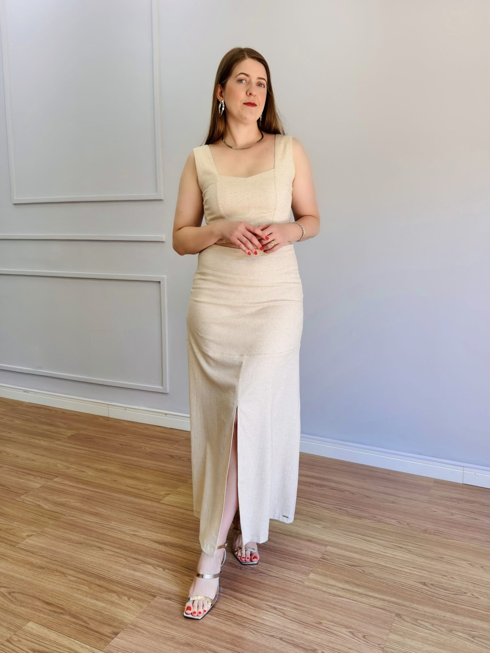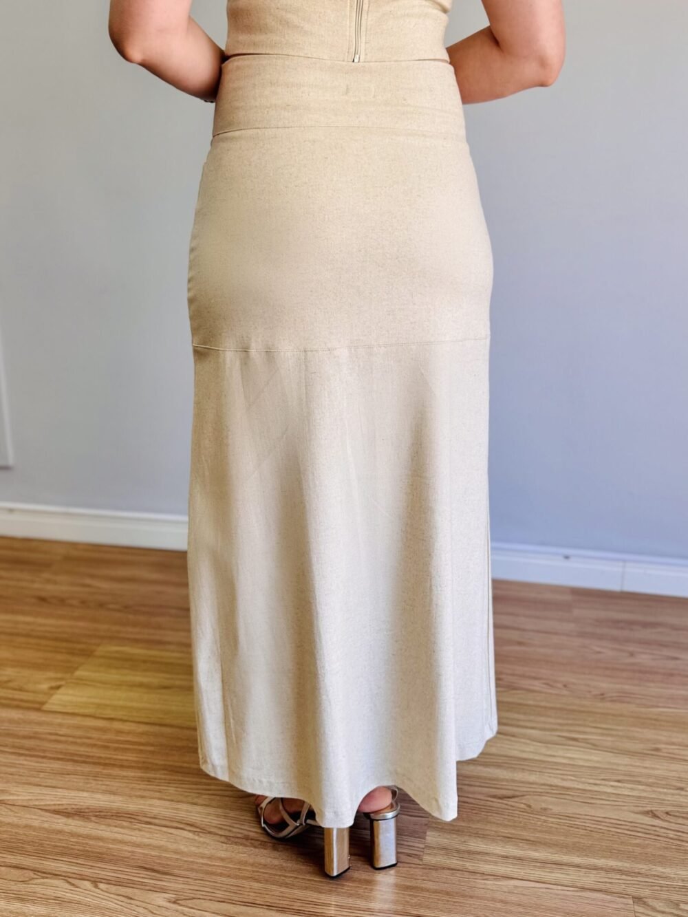 A Saia Menorca Cru é a definição de elegância e feminilidade com um toque contemporâneo. Confeccionada em linho com elastano, sua composição garante caimento impecável, conforto e leve elasticidade, acompanhando os movimentos do corpo com suavidade.
