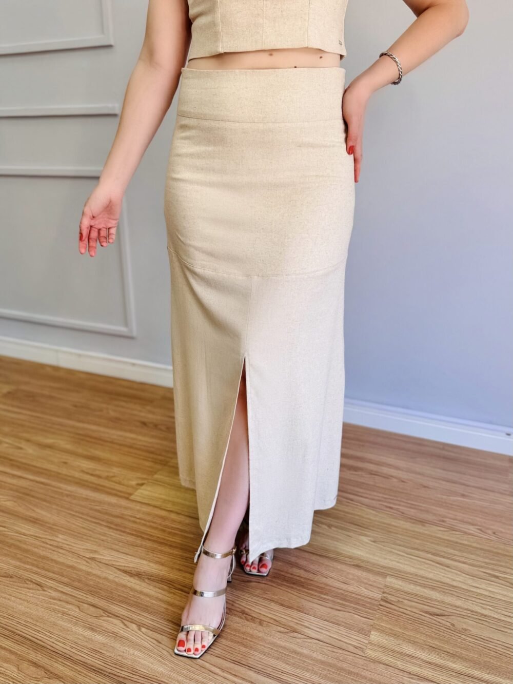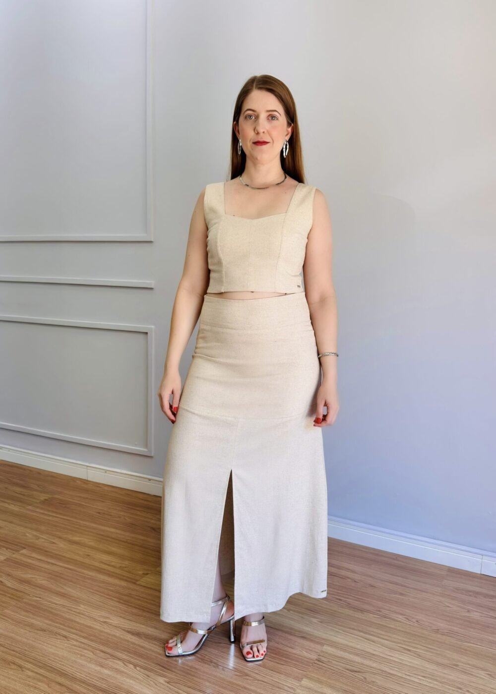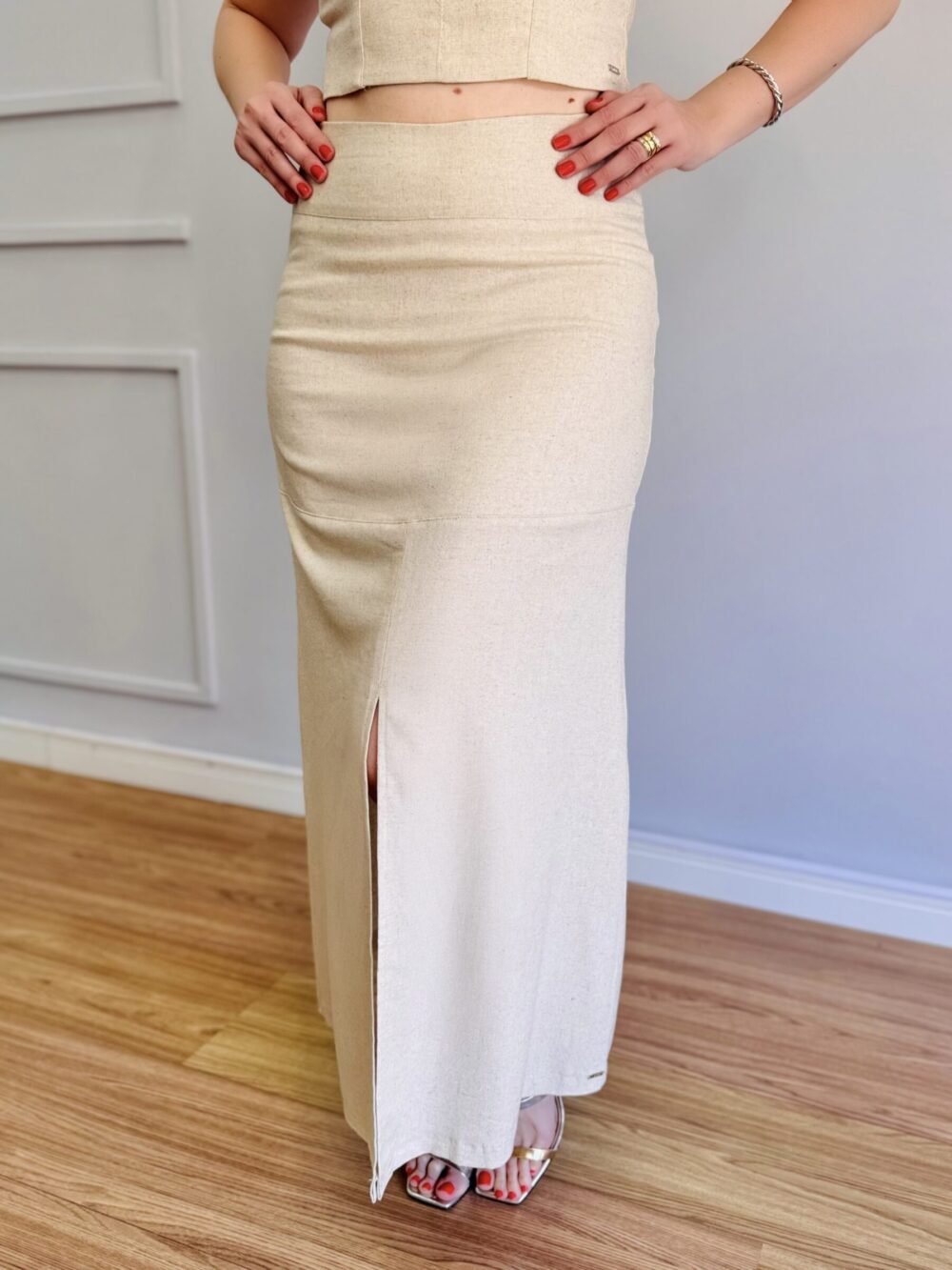 Com comprimento midi, é uma peça versátil que transita com facilidade entre looks casuais elegantes e produções mais sofisticadas, especialmente quando combinada com o Top Menorca Cru para um conjunto harmônico e atemporal.