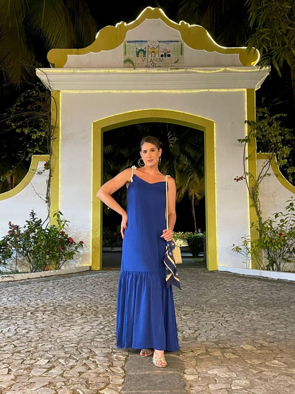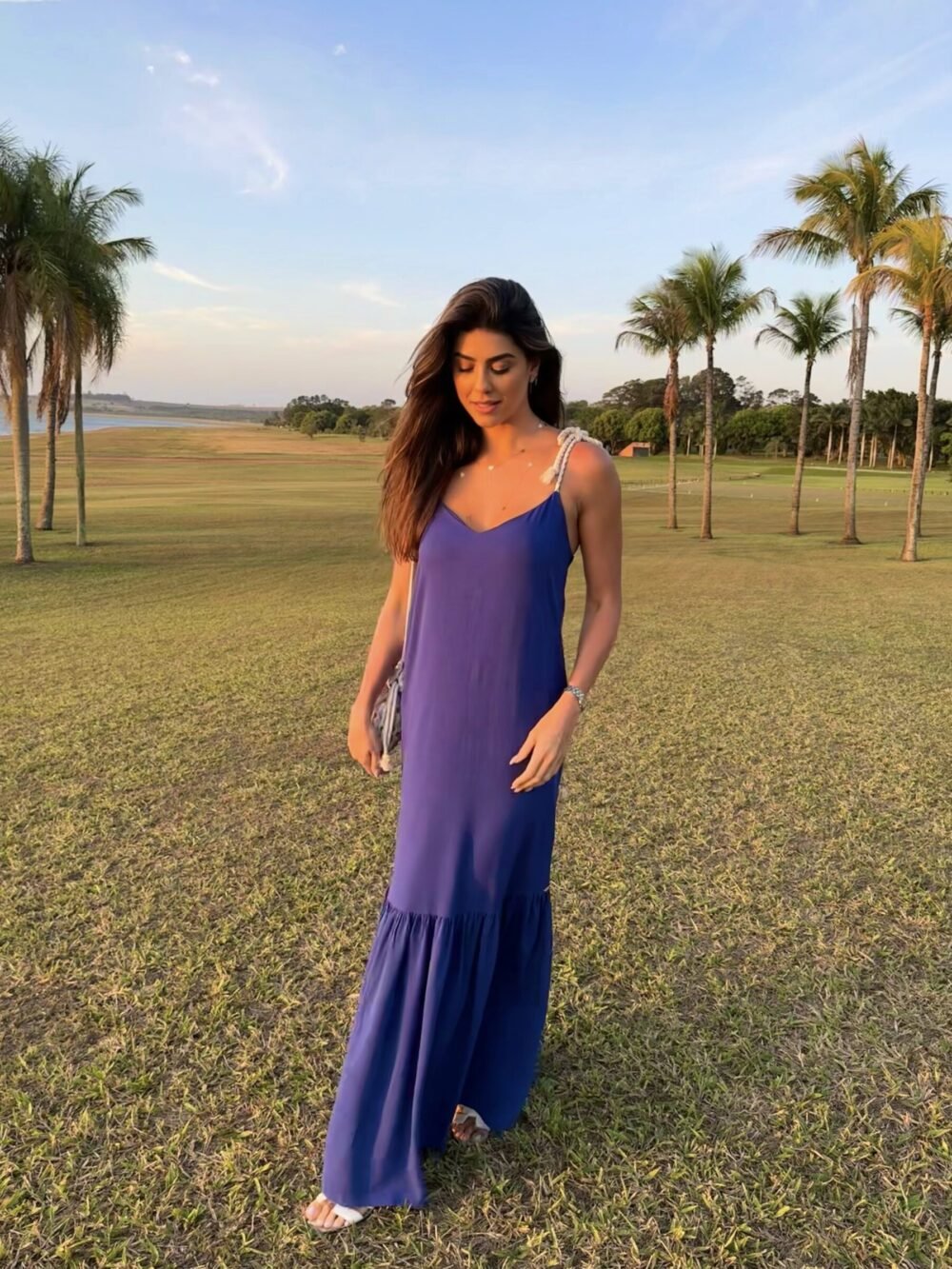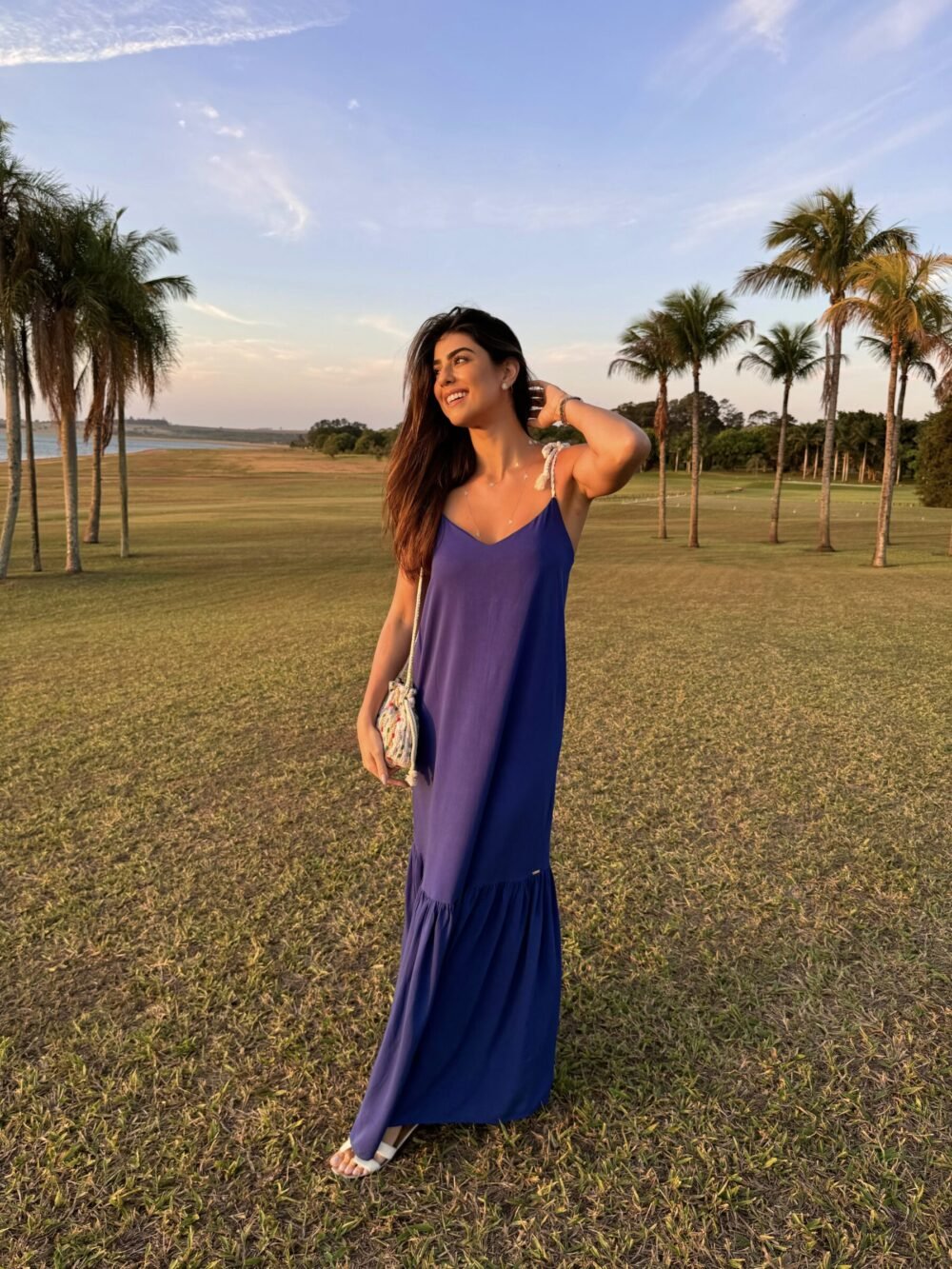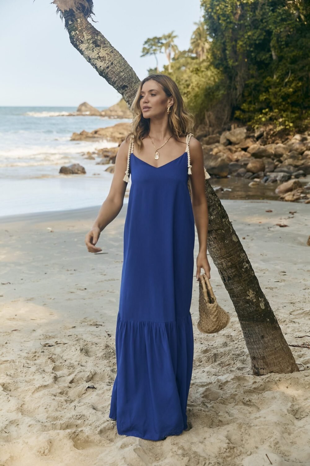 Vestido longo com barrado, alças de cordão que podem ser reguladas. Possui elástico nas costas para melhor adaptar-se ao corpo. Confeccionado em Viscose Premium.