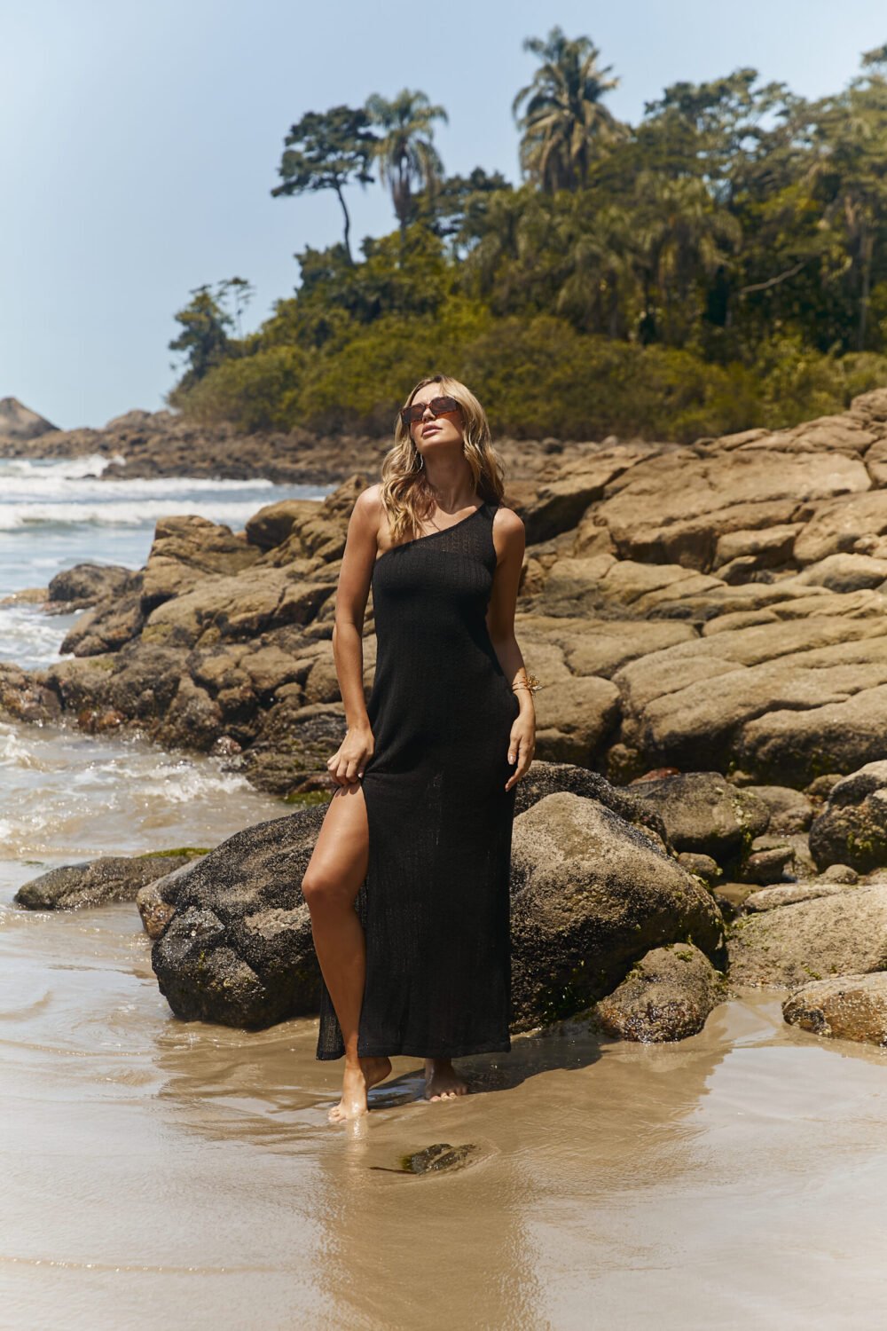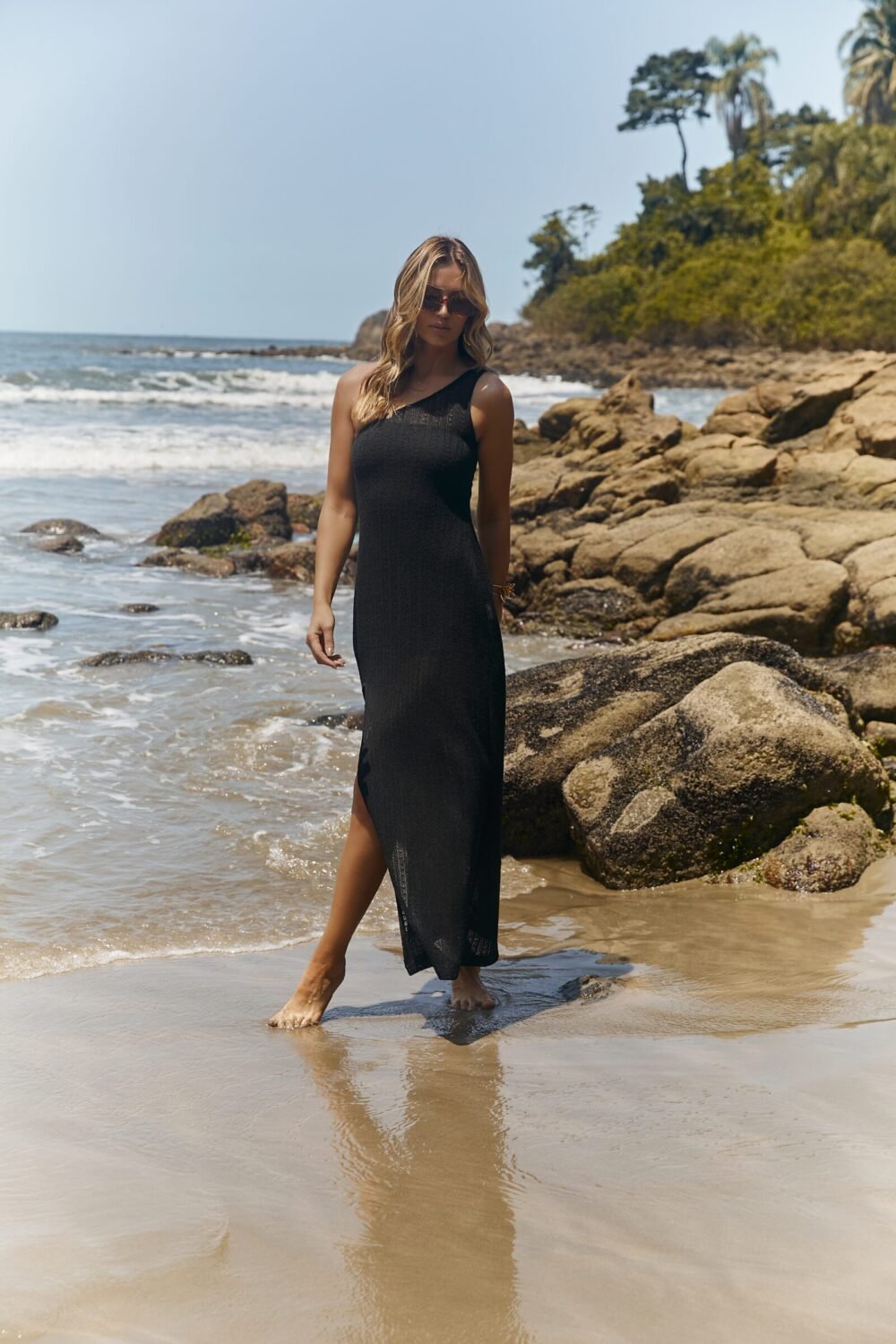 Vestido longo, com fenda frontal, confeccionado em malha de tricot, super confortável, modelagem exclusiva Lorrí. Pode ser usado como saída de praia ou em looks casuais.