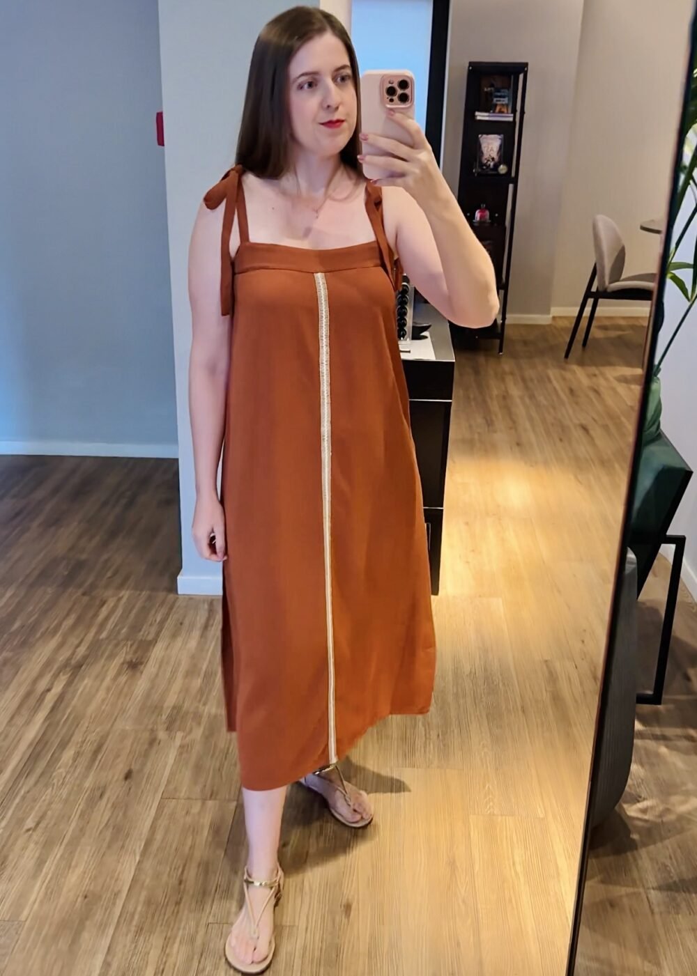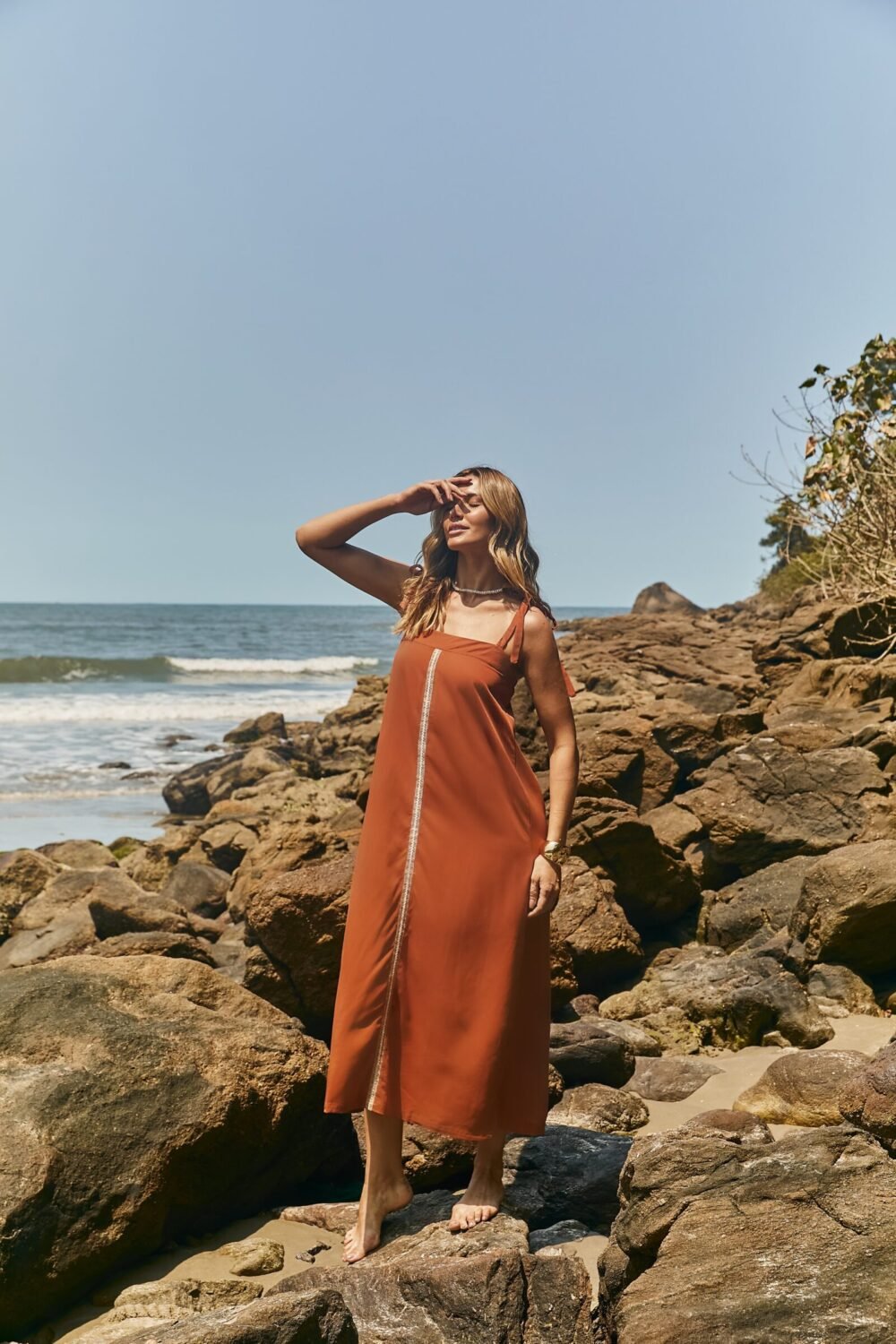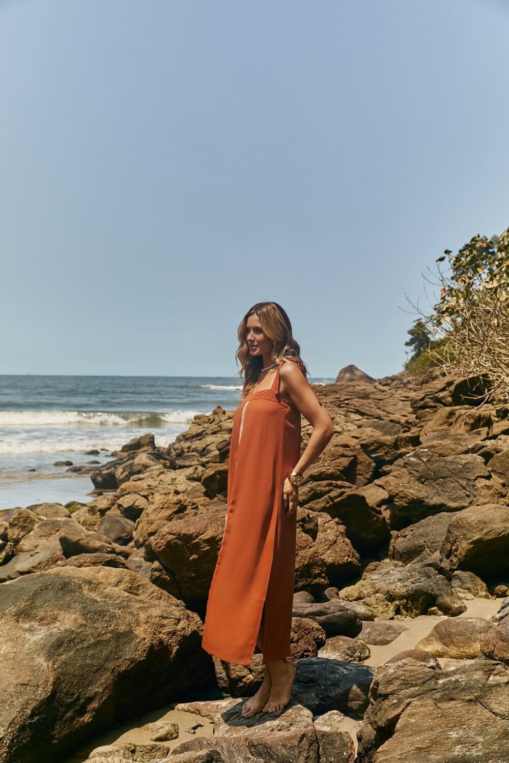 Vestido de comprimento midi, confeccionado em Viscose Premium, com alças que podem ser reguladas. Possui fenda com abertura nas laterais.