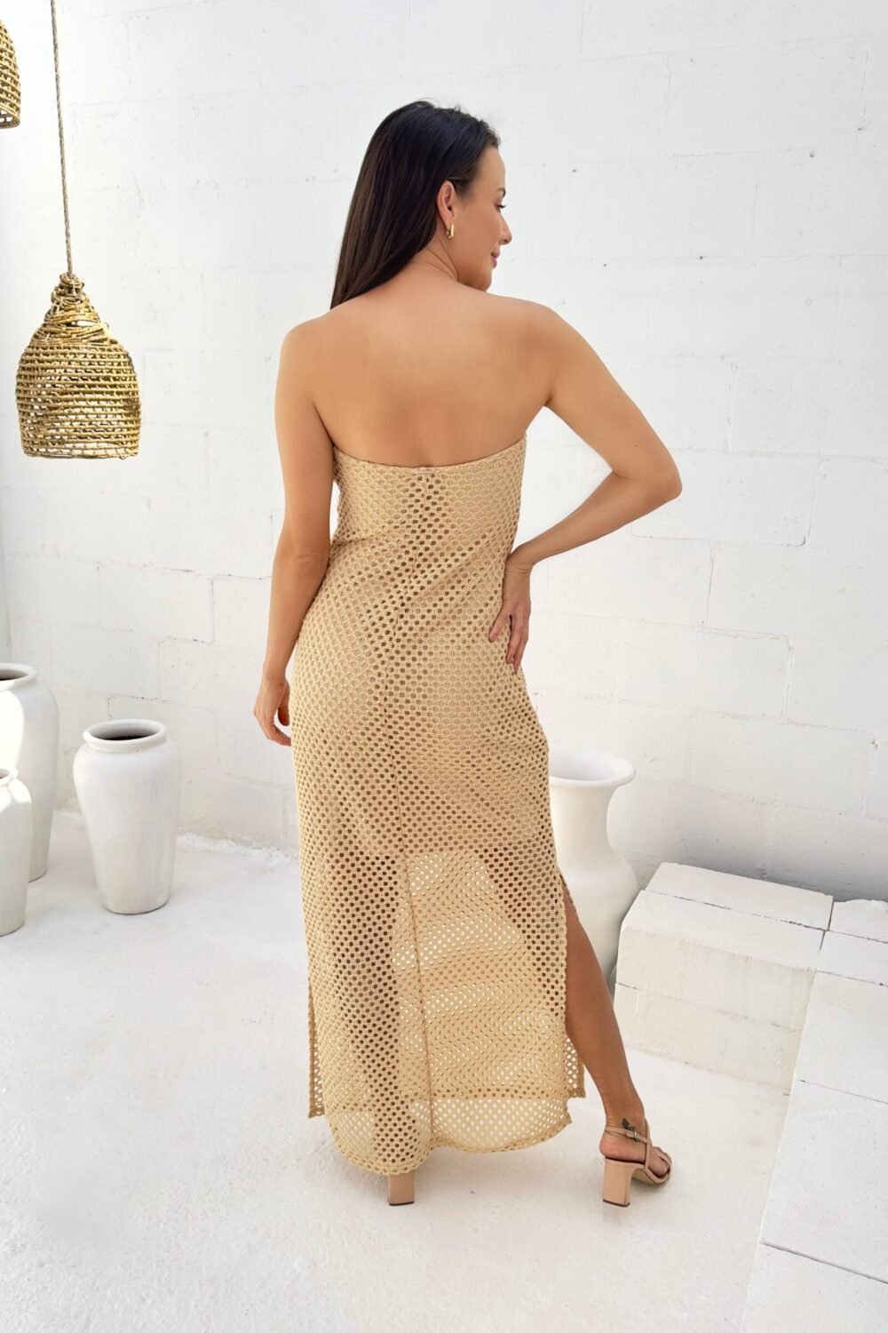 Vestido longo em tecido telado. Tomara que caia, possui elastico no decote para melhor ajuste, e ziper na lateral.